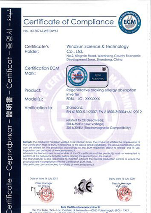 新風(fēng)光電子公司的軌道交通再生制動(dòng)能量吸收逆變裝置,已通過(guò)歐盟安全準(zhǔn)入認(rèn)證(CE認(rèn)證)驗(yàn)收并獲得CE認(rèn)證證書(shū),產(chǎn)品在質(zhì)量性能和安全性能方面都符合歐盟國(guó)家的出口質(zhì)量標(biāo)準(zhǔn)。