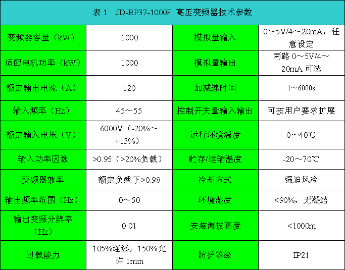 JD-BP37-1000F 高壓變頻器技術參數如表1所示。