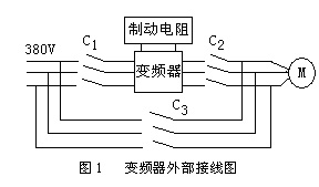 為使變頻器故障時不耽誤生產(chǎn),可加工工頻旁路,其應(yīng)用示意圖如圖1所示。變頻器運行時,開關(guān)C1和C2全部合閘,C3斷開;變頻器故障時C1和C2斷開,C3合閘;變頻器運行,C3和C1,C2聯(lián)鎖,不會發(fā)生合閘的情況。