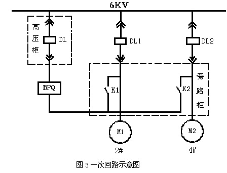 變頻器供電電源及其保護(hù)由DL提供,速斷保護(hù)整定值按630KW重新整定。同時(shí)增加一面旁路柜,旁路柜有2個(gè)高壓隔離開關(guān),通過開關(guān)組合,兩臺(tái)電機(jī)均可變頻運(yùn)行。