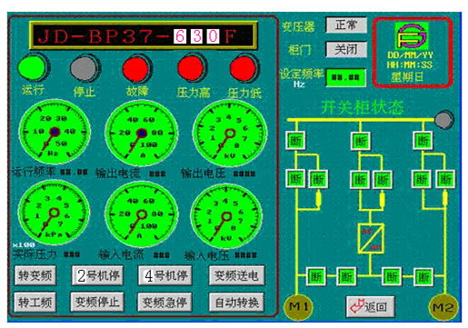變頻提供手動(dòng)旁路開關(guān),使水泵機(jī)組既可變頻運(yùn)行,又可工頻運(yùn)行。