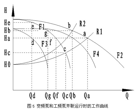 這次改造的是齊魯石化供排水廠的生產(chǎn)用水,在生產(chǎn)用水中,電廠又是一個(gè)大戶,供水壓力以滿足電廠需求為主。水廠一般情況下開兩臺(tái)水泵即可滿足供水要求。在電廠補(bǔ)水時(shí),需調(diào)高供水壓力至0.56MPa,一次補(bǔ)水大約20-30分鐘,其補(bǔ)水沒有一定的規(guī)律,不補(bǔ)水時(shí),壓力維持在0.50MPa。變頻改造后,采用恒壓供水,由圖6可知變頻泵與工頻泵并聯(lián)運(yùn)行時(shí)的特性曲線,工頻泵單獨(dú)運(yùn)行時(shí)的曲線如圖中F1所示,C點(diǎn)為單臺(tái)泵運(yùn)行時(shí)的工作點(diǎn),F(xiàn)2為兩臺(tái)相同的泵工頻運(yùn)行時(shí)的特性曲線,A為工作點(diǎn),揚(yáng)程Ha=Hf,流量Qa=2Qf。當(dāng)流量由Qa變?yōu)镼b時(shí),管網(wǎng)阻力曲線變?yōu)镽2,上述對(duì)應(yīng)關(guān)系仍然成立,此時(shí)在保證管網(wǎng)壓力不變的情況下,揚(yáng)程損失為ΔH=2*(Hb-Ha)(調(diào)節(jié)兩臺(tái)泵的閥門時(shí))或ΔH=He-Ha(調(diào)節(jié)一臺(tái)泵的閥門時(shí))。采用一臺(tái)變頻泵和一臺(tái)工頻泵并聯(lián)運(yùn)行供水時(shí),F(xiàn)3為變頻泵單獨(dú)運(yùn)行的特性曲線,F(xiàn)3為F1下方的一簇曲線,根據(jù)并聯(lián)運(yùn)行時(shí)工作揚(yáng)程相等,流量相加的原則,可得出兩臺(tái)泵的運(yùn)行曲線F4,此時(shí)流量Qb=Qd+Qf揚(yáng)程Ha=Hd=Hf,由圖5可知,當(dāng)流量減小越大時(shí),變速調(diào)節(jié)的節(jié)能效率也越大。