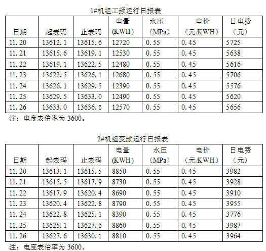 2#變頻機(jī)組一周耗電量為:61120 KWh,一周電費(fèi)為:27504元。