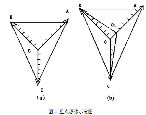 30個(gè)功率單元分為3組,每10個(gè)單元為一相。在正常情況下,三相輸出A、B、C平衡,中性點(diǎn)即星點(diǎn)在O點(diǎn)。如圖4所示,當(dāng)A相有一個(gè)單元故障時(shí),把星點(diǎn)由O點(diǎn)轉(zhuǎn)移到O1點(diǎn),而B(niǎo)相和C相經(jīng)過(guò)運(yùn)算,對(duì)O1的輸出要與A相一致。使整機(jī)的三相輸出依然平衡。此功能稱為“星點(diǎn)漂移”。