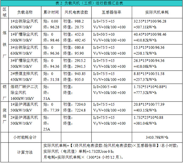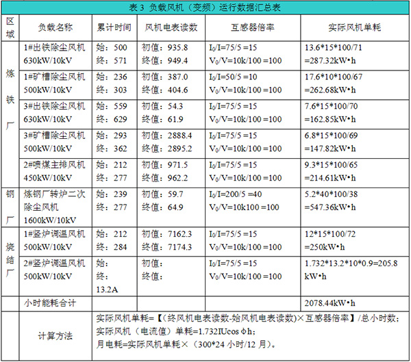 經(jīng)過新寶泰鋼鐵公司能源中心、各分廠測(cè)試和計(jì)量,系統(tǒng)達(dá)到了預(yù)期的節(jié)能效果。10月18 日至 11月5日完成改造后的數(shù)據(jù)采集,變頻運(yùn)行計(jì)量10月18 日 至10 月 21日(三天);工頻運(yùn)行計(jì)量 11月 1 日 至 11 月3 日(三天)。風(fēng)機(jī)工頻與變頻運(yùn)行數(shù)據(jù)統(tǒng)計(jì)如下表2、表3所示: