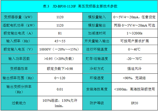 JD-BP38-1120F高壓變頻器技術(shù)參數(shù)如表3所示。