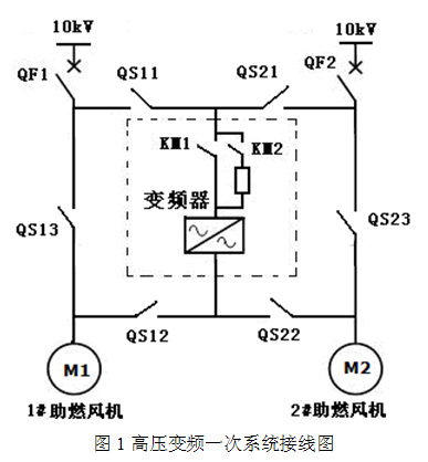 1#高爐熱風(fēng)爐助燃風(fēng)機(jī)2臺(tái),采用一用一備。變頻改造采用2臺(tái)助燃風(fēng)機(jī)共用一套高壓變頻器,2#高爐熱風(fēng)爐2臺(tái)助燃風(fēng)機(jī)共用一套高壓變頻器。以1#高爐2臺(tái)助燃風(fēng)機(jī)為例說(shuō)明控制過(guò)程。其一次系統(tǒng)接線圖路如圖1所示,通過(guò)切換高壓隔離開關(guān)把高壓變頻器切換到要運(yùn)行的風(fēng)機(jī)上去。如圖所示高壓變頻器可以拖動(dòng)1#風(fēng)機(jī)電動(dòng)機(jī)實(shí)現(xiàn)變頻運(yùn)行,也可以通過(guò)切換拖動(dòng)2#風(fēng)機(jī)電動(dòng)機(jī)實(shí)現(xiàn)變頻運(yùn)行。1#、2#風(fēng)機(jī)電動(dòng)機(jī)均具備工頻旁路功能。