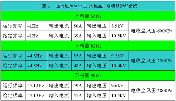 2011年6月廠節(jié)能服務(wù)中心隨機對2#焙燒爐不同下料量的情況下,對除塵ID風(fēng)機高壓變頻器進行了測試,記錄數(shù)據(jù)如表5所示。