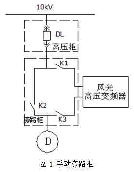 圖1旁路柜中,共有3個高壓隔離開關(guān),為了確保不向變頻器輸出端反送電,K2與K3采用電磁互鎖操動機(jī)構(gòu),實現(xiàn)電磁互鎖。當(dāng)K1、K3閉合,K2斷開時,電機(jī)變頻運(yùn)行;當(dāng)K1、K3斷開,K2閉合時,電機(jī)工頻運(yùn)行,此時變頻器從高壓中隔離出來,便于檢修、維護(hù)和調(diào)試。