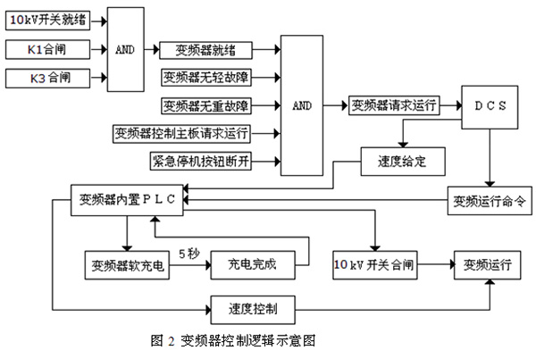 如圖2所示,當(dāng)所有開機(jī)條件都具備后,DCS發(fā)出變頻運(yùn)行命令,變頻器內(nèi)置PLC發(fā)出“合閘”信號至10kV高壓柜,高壓斷路器開關(guān)合閘,變頻器進(jìn)行軟充電,5S后充電完成,變頻器處于就緒狀態(tài),由DCS給出4~20mA信號控制變頻器頻率來改變電機(jī)轉(zhuǎn)速。