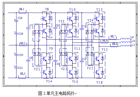 系統(tǒng)包括主電路、檢測部分、控制部分。主電路的關鍵是開關元件IGBT,本部分的作用為完成電力的轉(zhuǎn)換,將直流電網(wǎng)富余的電能轉(zhuǎn)換為交流電并網(wǎng)。檢測部分主要由傳感器組成,其主要作用為檢測交流電網(wǎng)的電壓、電流、相位,檢測直流側的電壓、電流,并將檢測到的物理信號轉(zhuǎn)換為弱電信號,將其送入控制單元??刂茊卧淖饔脼楦鶕?jù)傳感器輸入的信號和外部輸入的信號做出判斷,輸出PWM信號控制IGBT動作,使其完成電能的轉(zhuǎn)換;控制單元還具有輸入輸出的接口,接受外部指令信號,并將本系統(tǒng)的狀態(tài)傳給相關的系統(tǒng)。元件每個單元內(nèi)部采用三點平逆變結構。圖紙幅度所限,在此只給出每個單元的主電路拓撲如圖2所示。采用電解電容作為逆變前的儲能元件,降低直流母線的電壓波動。主開關器件選用IGBT,輸出側使用電抗器濾波。核心控制芯片采用TI公司的TMS320LF2000系列的芯片,此系列的芯片是專門為電力電子轉(zhuǎn)換而設計的芯片,有豐富的片內(nèi)外設功能。包含有如下外設:事件管理器:定時器和用于數(shù)字電機控制的PWM發(fā)生器;CAN接口 ;具有16通道10位A/D;SPI串行外設接口;SCI串行通信接口。