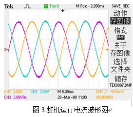 在做試驗時發(fā)現(xiàn)隨著整機電流的增加,整機效率成增加之勢,整機諧波電流成減小之勢。圖3 為整機回饋電網(wǎng)電流2000A時的三相電流波形圖。通過檢測設備得知饋網(wǎng)電流完全滿足國家標準。